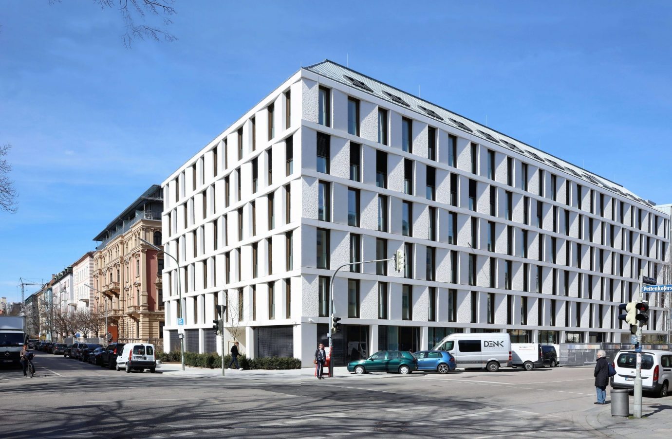 Die Kubatur des neuen Bürogebäudes orientiert sich an der umgebenden Bebauung. Der Neubau setzt mit seiner eleganten Fassade aus vertikal alternierend angeordneten Fenster- und Betonfertigteilelementen einen architektonischen Akzent und sorgt für die Vermittlung zwischen angrenzender historischer Bebauung und zeitgemäßer Architektur. Die Ecke Pettenkofer- / Goethestraße wird entsprechend aufgewertet.