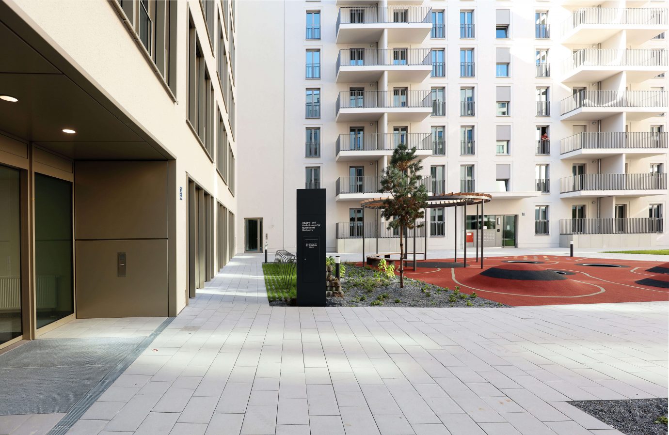 In stilvollem Kontrast zur modernen Formensprache der Gebäude steht der begrünte Innenhof. Das aufwendig gestaltete Freiflächen-Konzept verfügt über einen Kinderspielplatz und bildet mitten in Haidhausen eine städtische Oase.