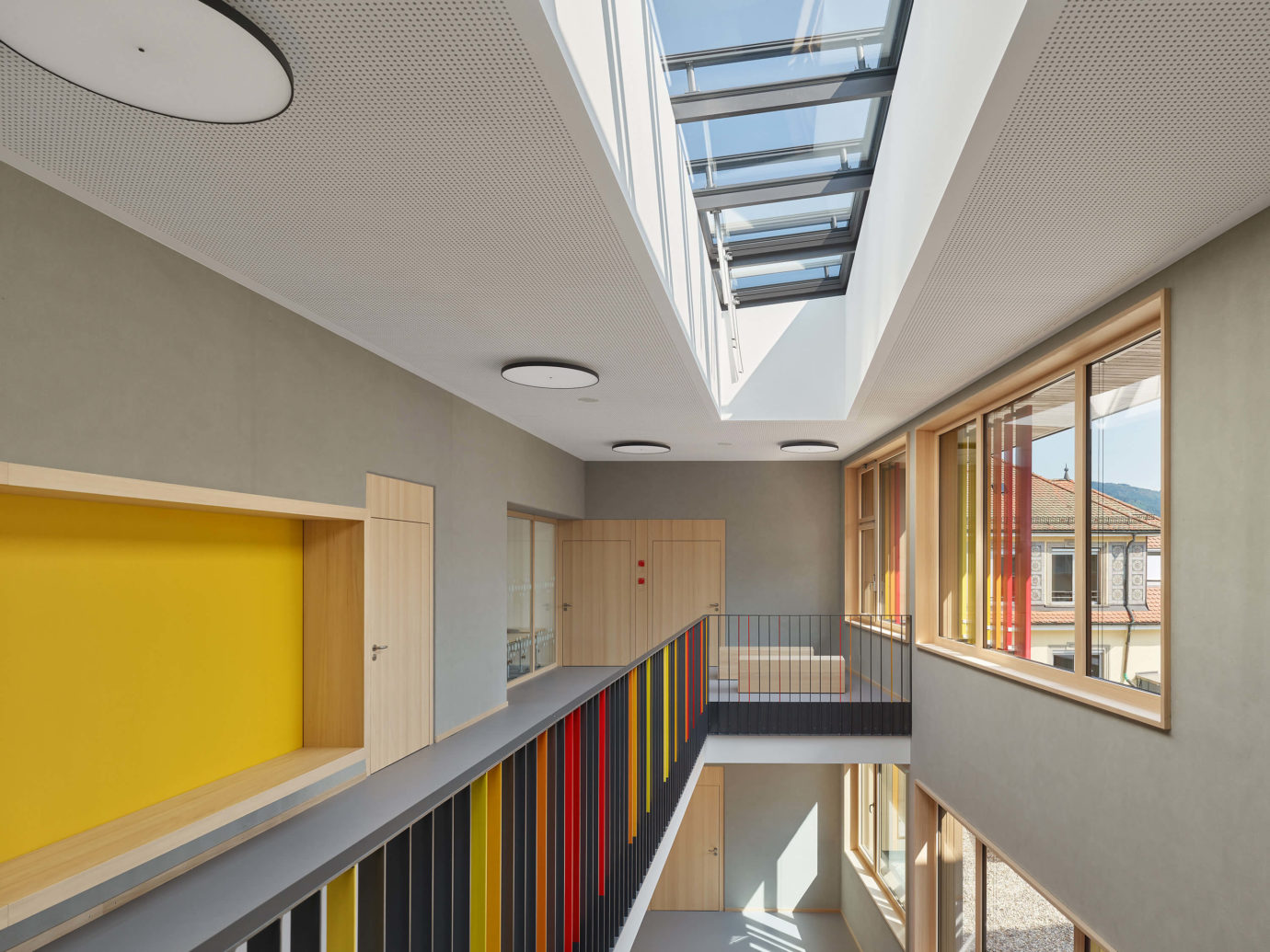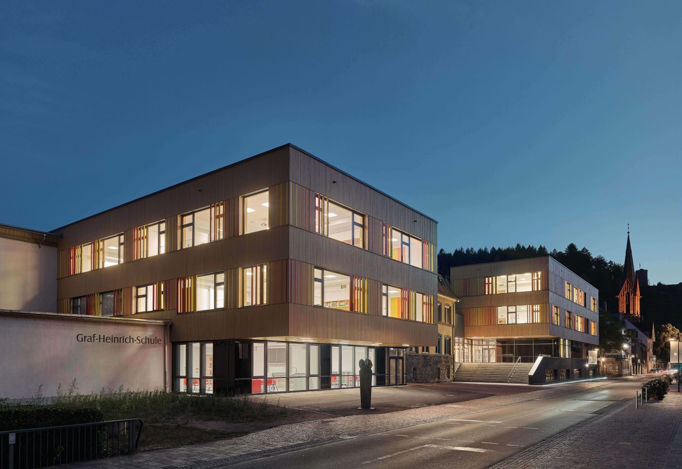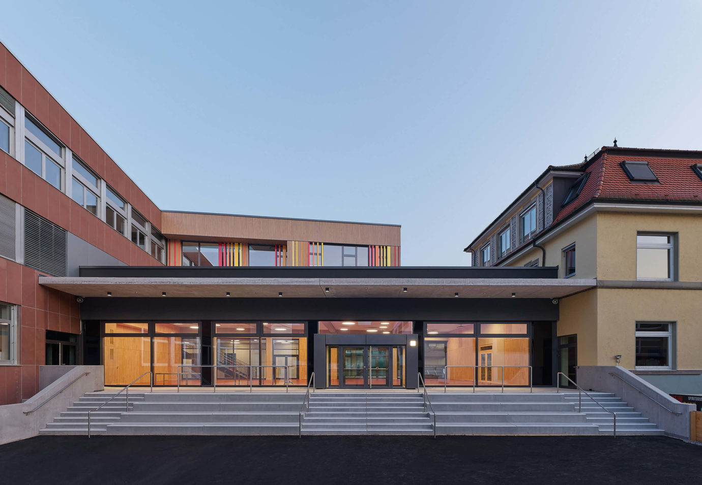 Ziel ist es, eine Synergie mit den Bestandsgebäuden herzustellen. Zwischen Hauptgebäude, historischem Schulgebäude und Telekomgebäude werden zwei Baukörper platziert, deren Obergeschosse vom historischen Gebäude abrücken, es somit freistellen und akzentuieren.