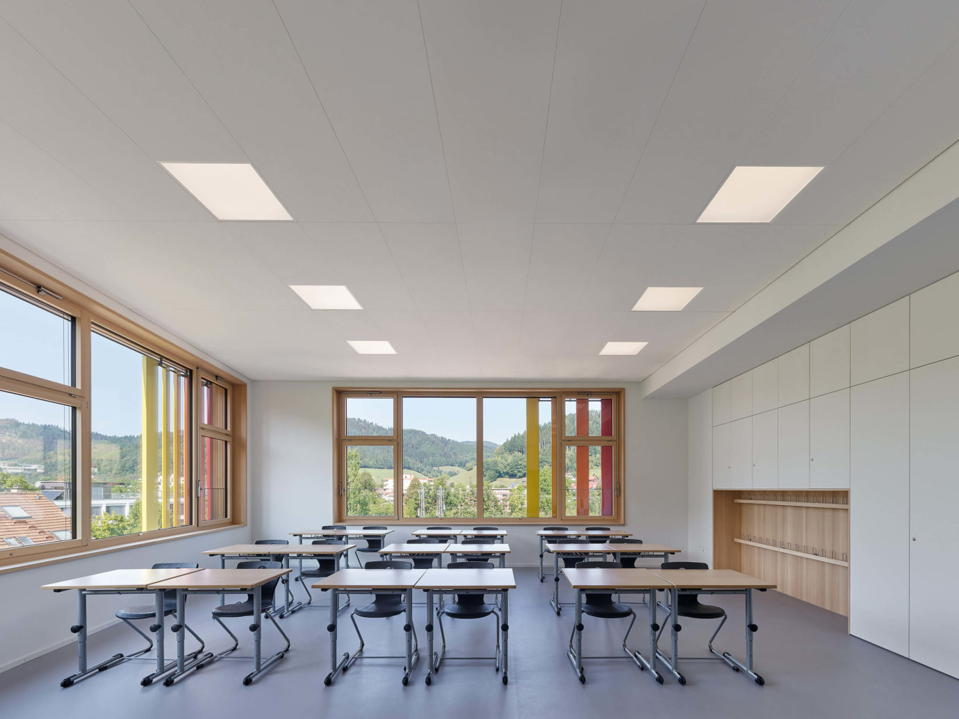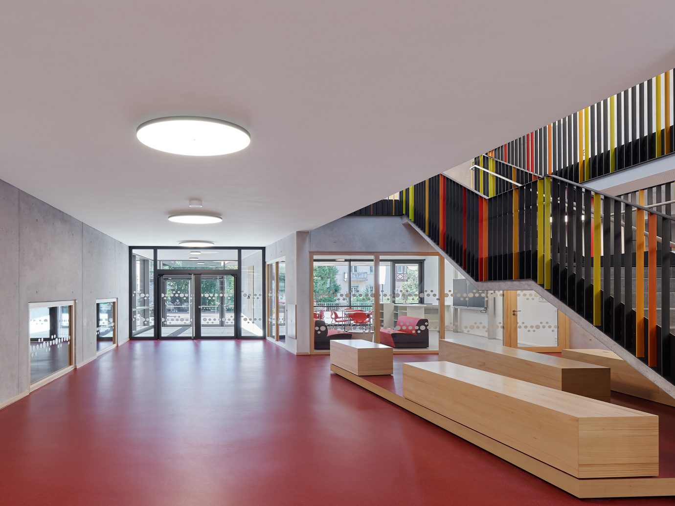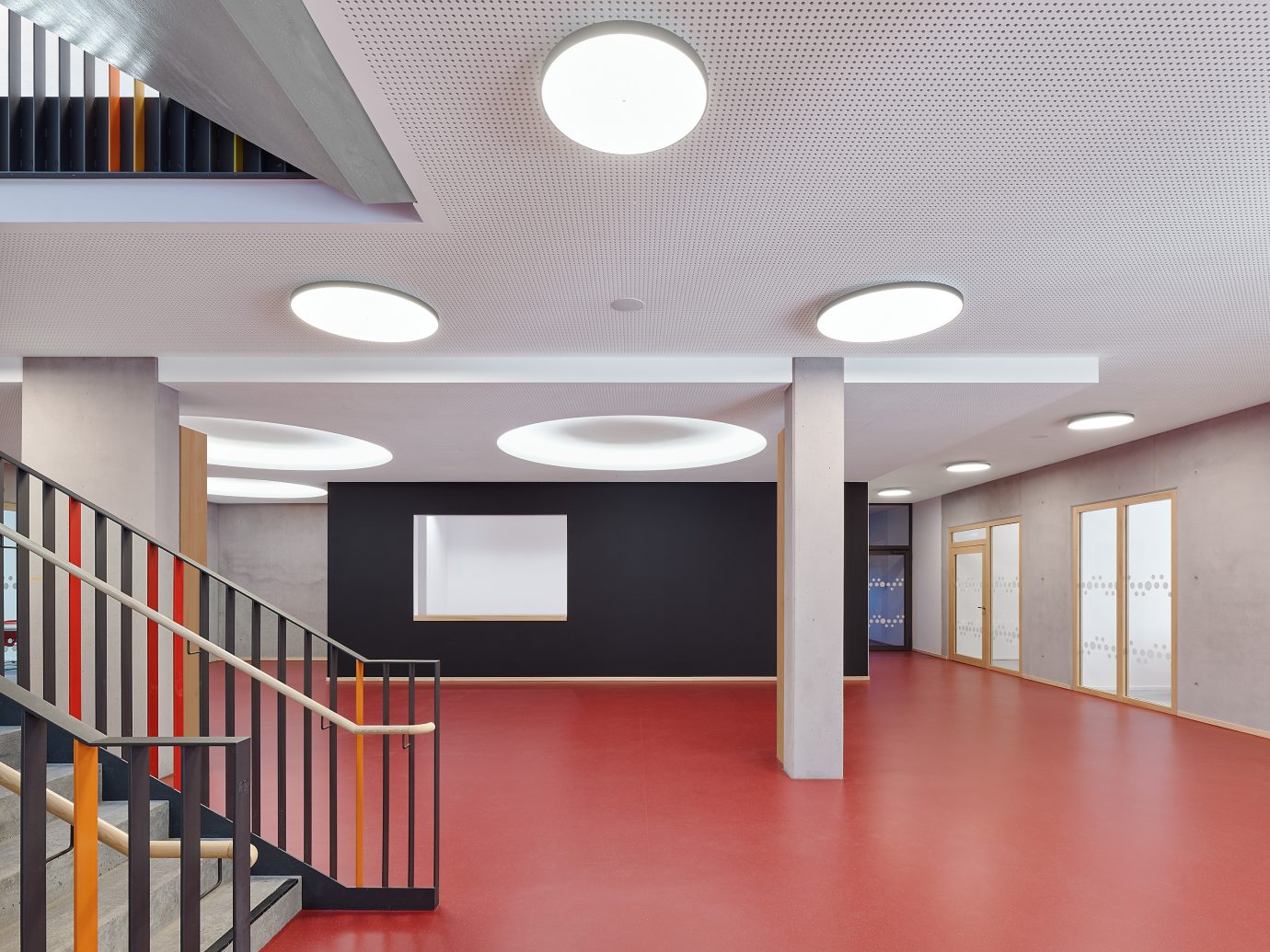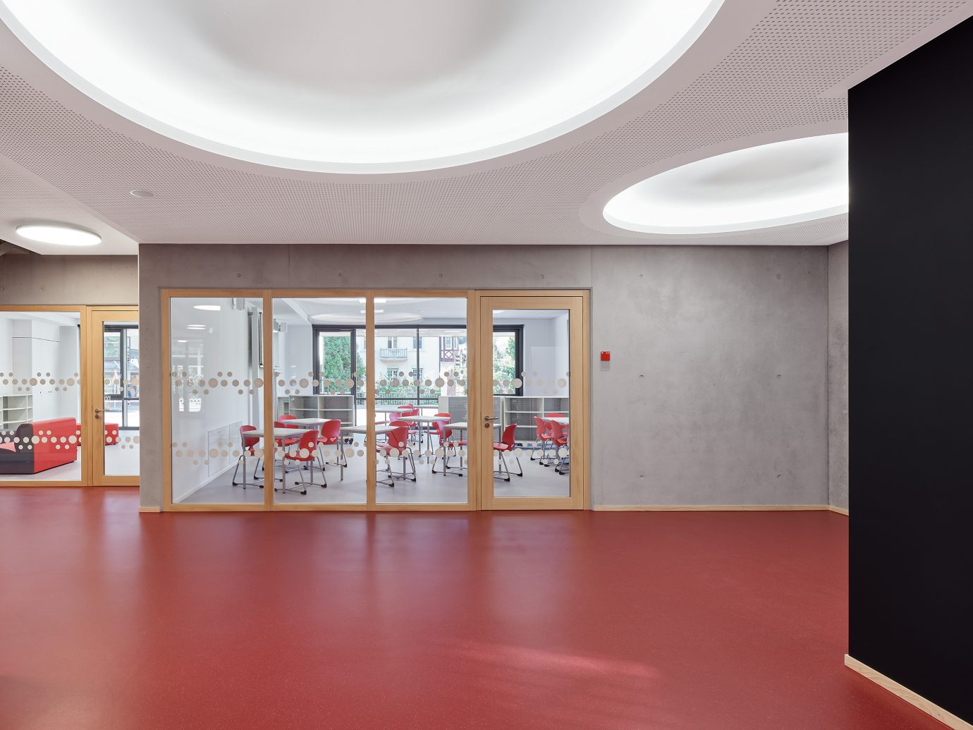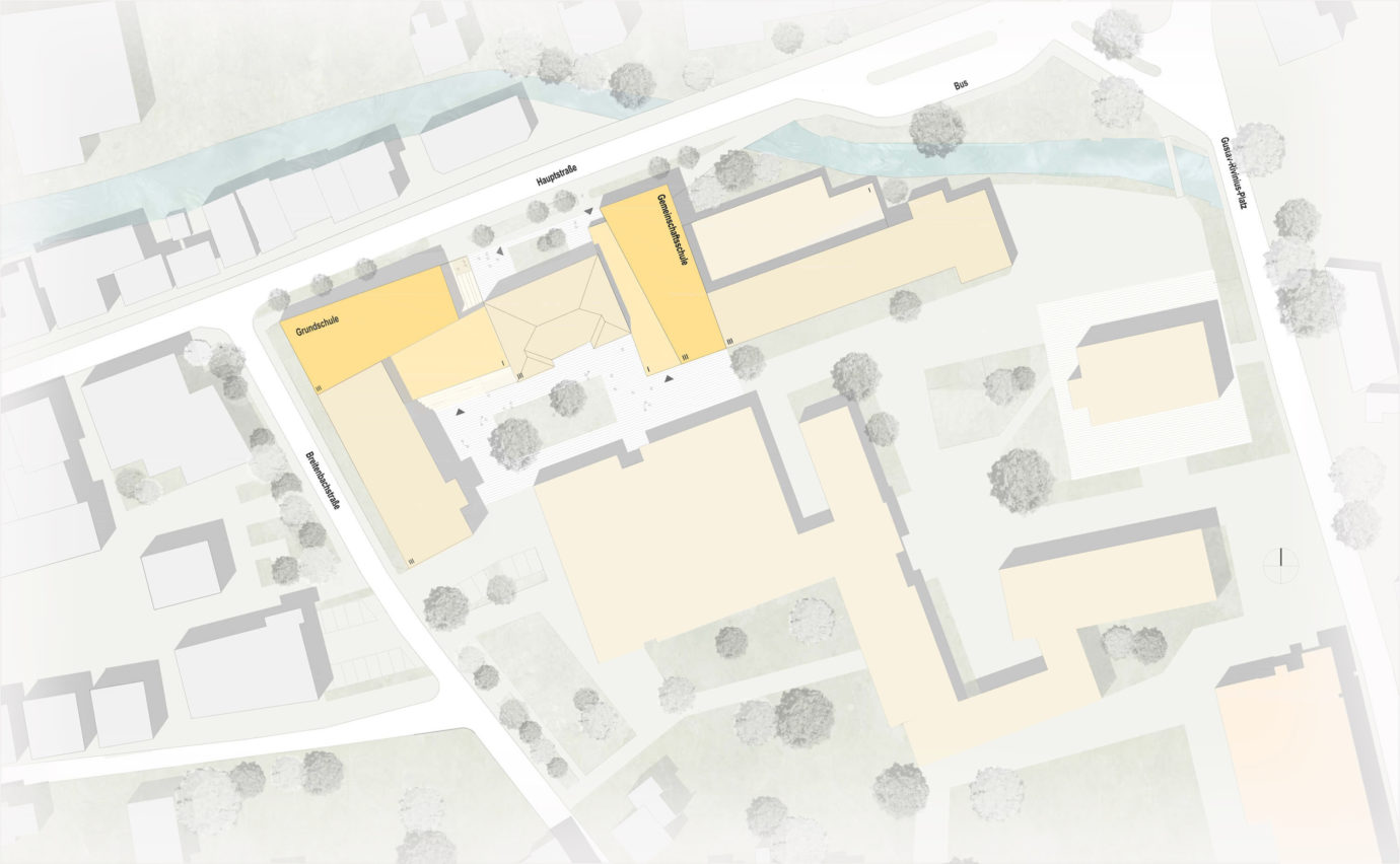 Daher wird das Erdgeschoss des Grundschul-Neubaus auf dem Niveau des Erdgeschosses des historischen Gebäudes angeordnet. Im Hauptgebäude und anschließenden Neubau ist die Gemeinschaftsschule untergebracht. Räume, die sich bisher im Telekomgebäude befanden, werden in den entsprechenden Gebäuden situiert.