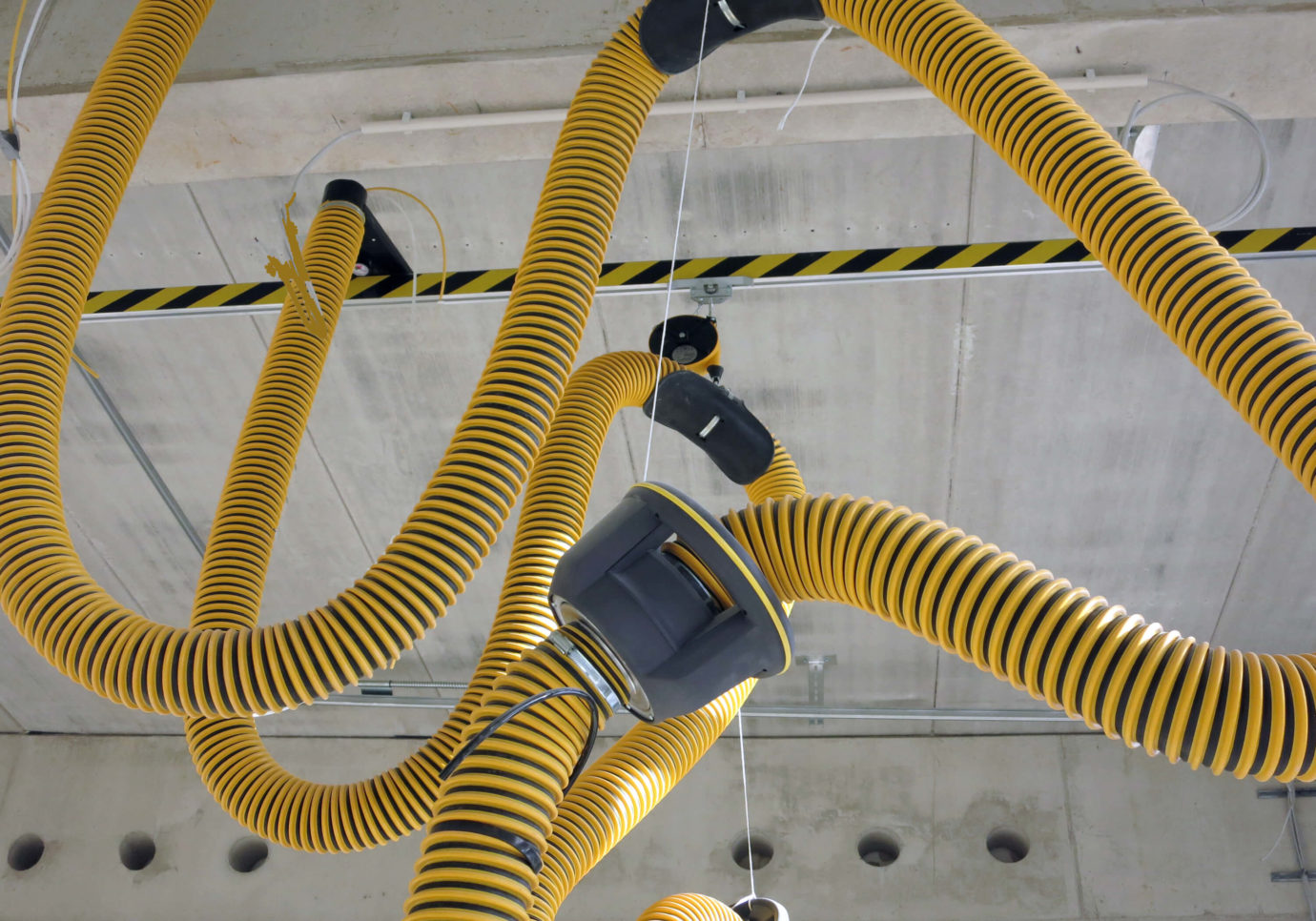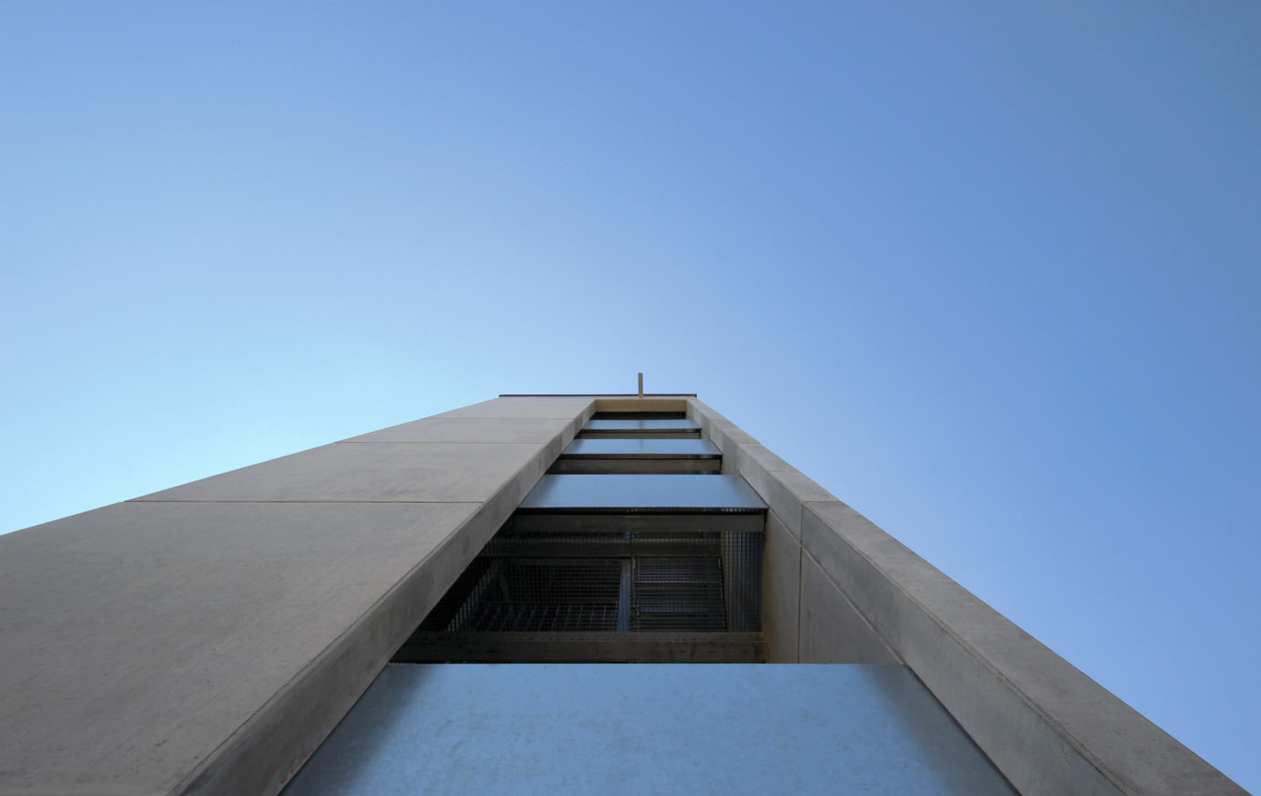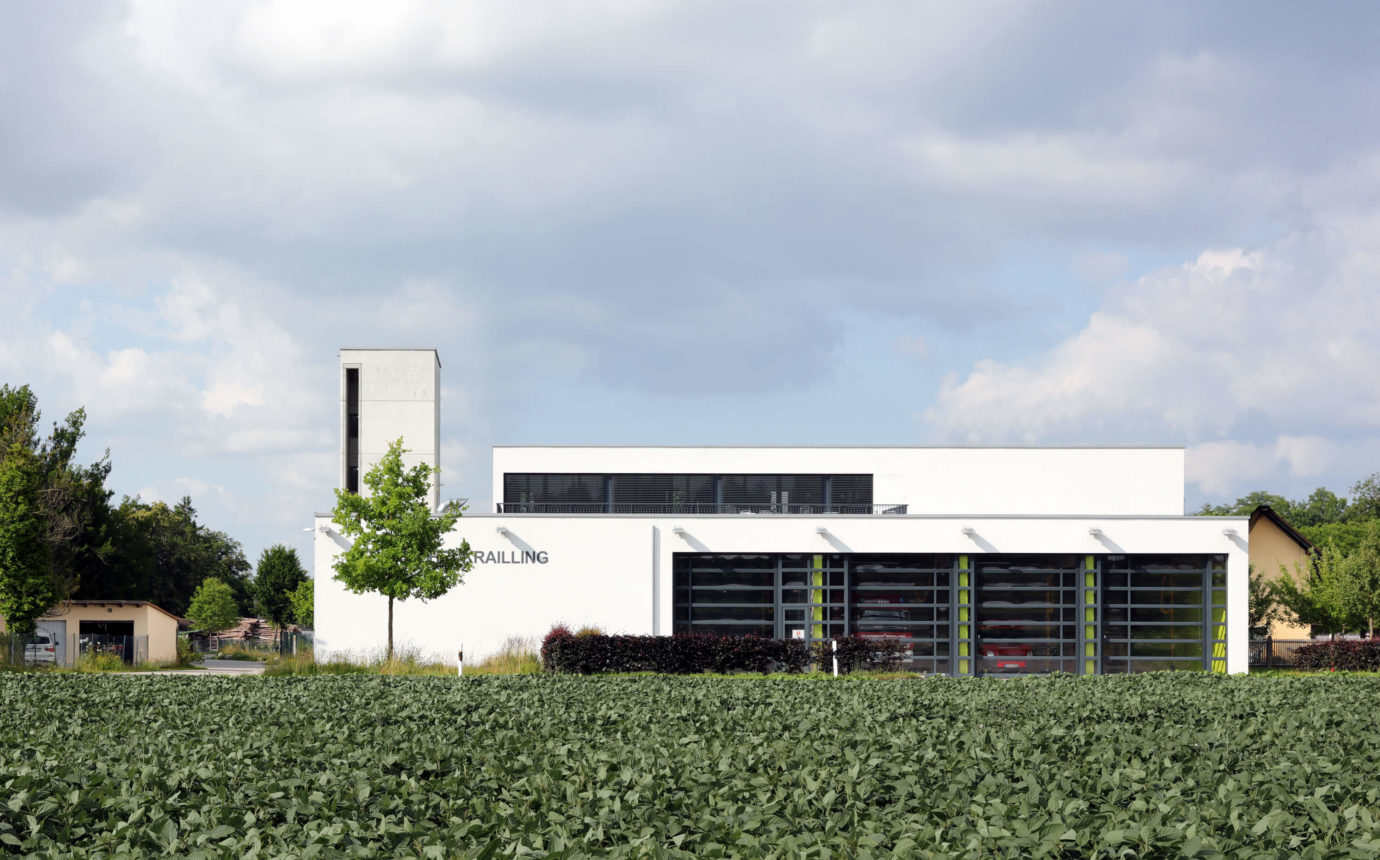 Die Fahrzeughalle mit dem dreigeschossigen Hauptgebäude stellt sich als weißer Kubus dar. Der Schlauch- und Übungsturm in Sichtbeton steht dabei ein wenig abgerückt vom restlichen Baukörper. Durch die Anbindung des dreigeschossigen Riegels unmittelbar an die Fahrzeughalle entsteht eine kompakte Anlage, die kurze Wege und eine gute Orientierung garantiert.