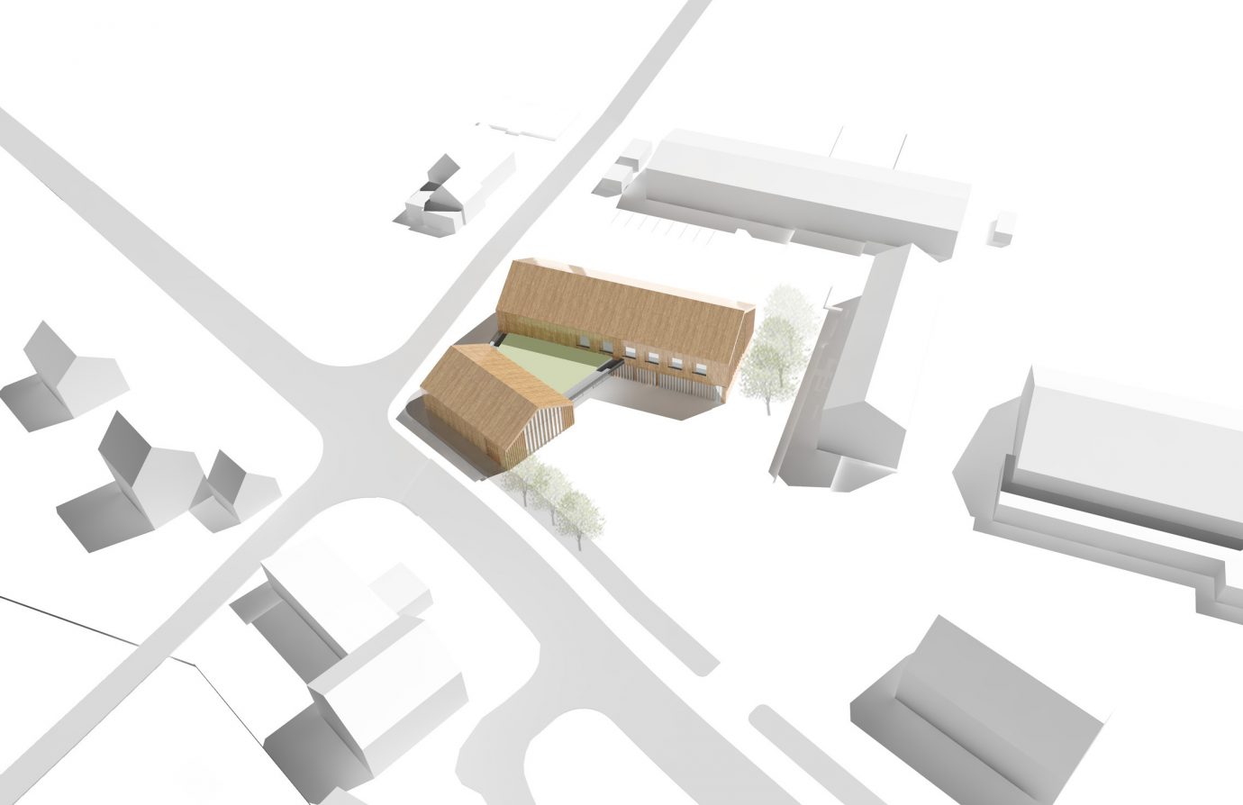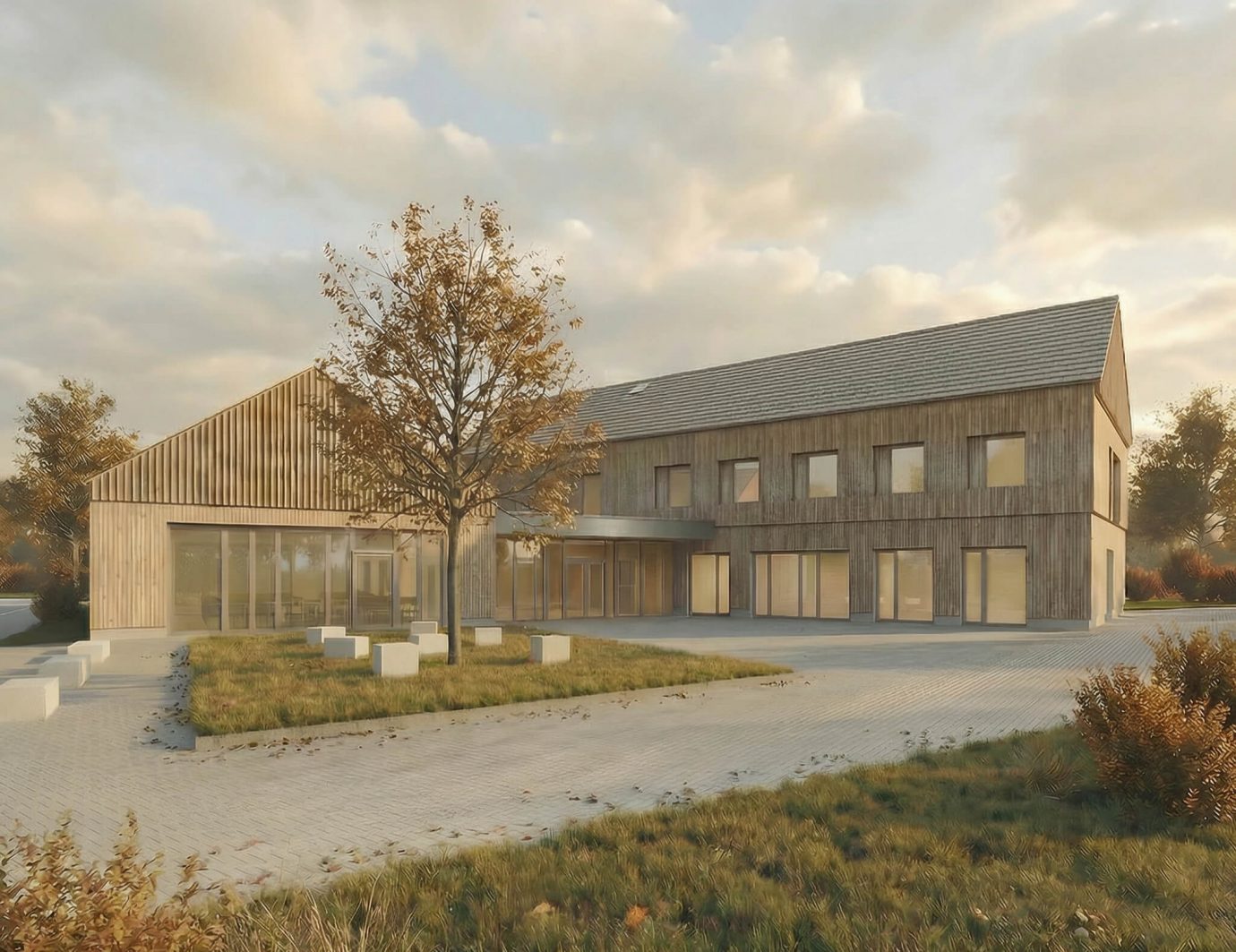 Der Entwurf sieht zwei miteinander verbundene Baukörper mit Satteldächer in unterschiedlicher Ausrichtung vor. Durch die Differenzierung der Baumassen wird die kleinteilige dörfliche Struktur aufgenommen und neu interpretiert.