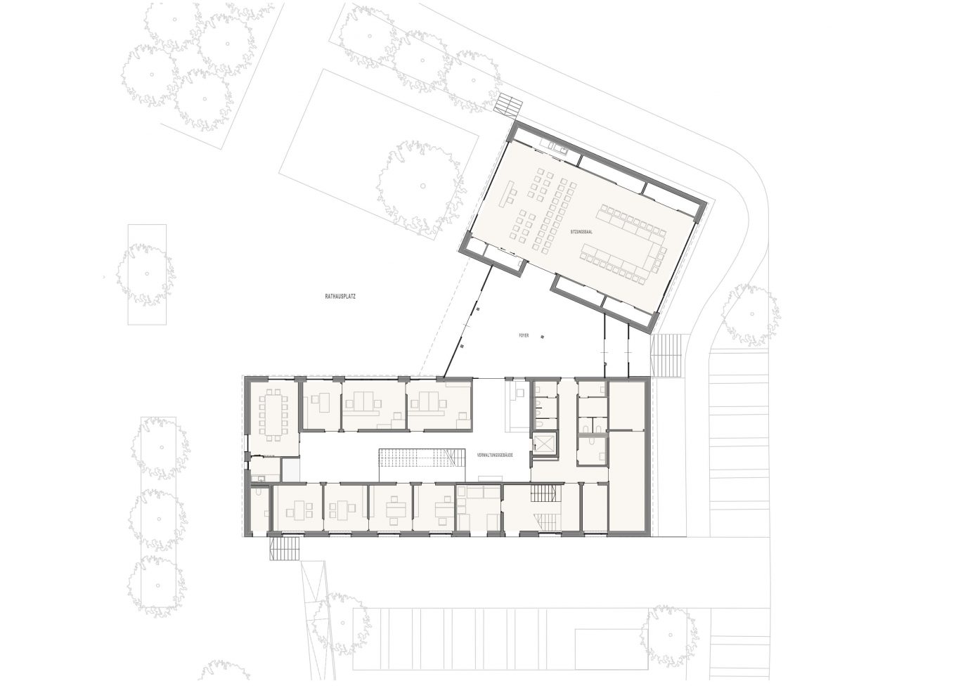 Parallel zur Hauptstraße wird ein eingeschossiger Gebäudekörper, der als Herzstück den Sitzungs-und Trausaal beherbergt, situiert. Ein zweigeschossiger, ruhiger Querbau orientiert sich lotrecht zum Pfarrheim. Die Gebäudekonfiguration bildet somit räumlich den neuen Rathausplatz.