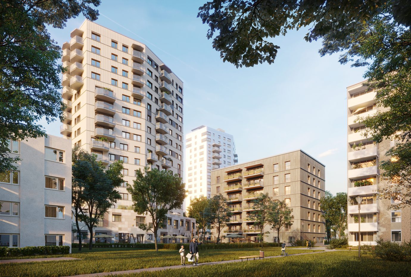 Die Bayerische Versorgungskammer plant ihre knapp 1.500 Wohnungen umfassende Wohnsiedlung in Fürstenried-West aus den 60er- und 70er-Jahren nachzuverdichten und damit in München neuen, dringend benötigten Wohnraum zu schaffen. Wesentliche Ziele sind bauliche Ergänzungen der vorhandenen Gebäudestruktur durch Aufstockungen und Neubauten unter Berücksichtigung des städtebaulichen Gesamtkonzepts und der gebietstypischen Gebäudestruktur. Das städtebauliche Konzept basiert auf dem Leitbild der punktuellen und flächenschonenden Gebietsergänzung, der behutsamen Ergänzung der vorhandenen Freiraumqualitäten und der Qualifizierung des Straßenraums. Die Höhenentwicklung der Baukörper orientiert sich weitgehend am Bestand und steigt zu den Rändern des Planungsumgriffs hin an. Die vier Hochpunkte entlang der Forst-Kasten-Allee markieren mit 12 bis 18 Geschossen den nördlichen Abschluss des Quartiers zum Landschaftsschutzgebiet „Waldfriedhof“ Das Gebäude ist als Hybridkonstruktion konzipiert. Die Fassade wird als Holztafelkonstruktion mit vorgehängten, vertikaler Aluminiumtrapezblechelementen ausgeführt. Die Stahlbetonbalkone erhalten eine Verkleidung aus Trapezlochblech.