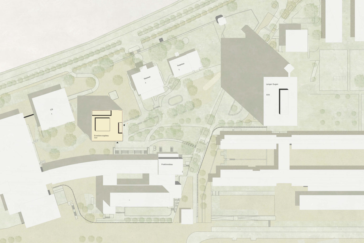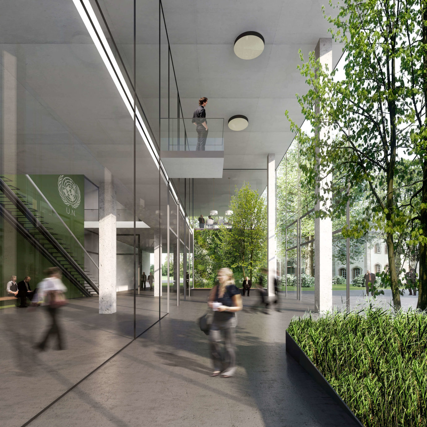 Der Bereich für den Erweiterungsbau auf dem UN Campus umfasst das Parkgelände zwischen Langem Eugen, dem Alten Abgeordneten Hochhaus, dem Alten Wasserwerk und dem Pumpenhaus. Die Atmosphäre in diesem Bereich wird bestimmt durch den gewachsenen Baumbestand und die ehemaligen Bundestagsbauten. Das neue Erweiterungsgebäude ermöglicht es, durch die Konzentration der Flächen, den grünen Charakter zu erhalten und einen Campus mit vielfältigen Qualitäten zu schaffen. Von jedem Standpunkt des Campus kann man weiterhin den Rheinverlauf überblicken. Der „punktförmige“ Erweiterungsbau mit zentralem Erschließungskern ermöglicht eine Orientierung aller Arbeitsplätze zur Fassade. In allen 15 Geschossen sind Ausblicke in alle Himmelsrichtungen möglich. Der „genius loci“ bleibt erhalten, denn neue Arbeitsplätze mit freundlicher, licht durchfluteter Atmosphäre werden geschaffen. Der Bezug zum Außenraum, Sonneneinstrahlung und eine offene Atmosphäre haben höchste Priorität.