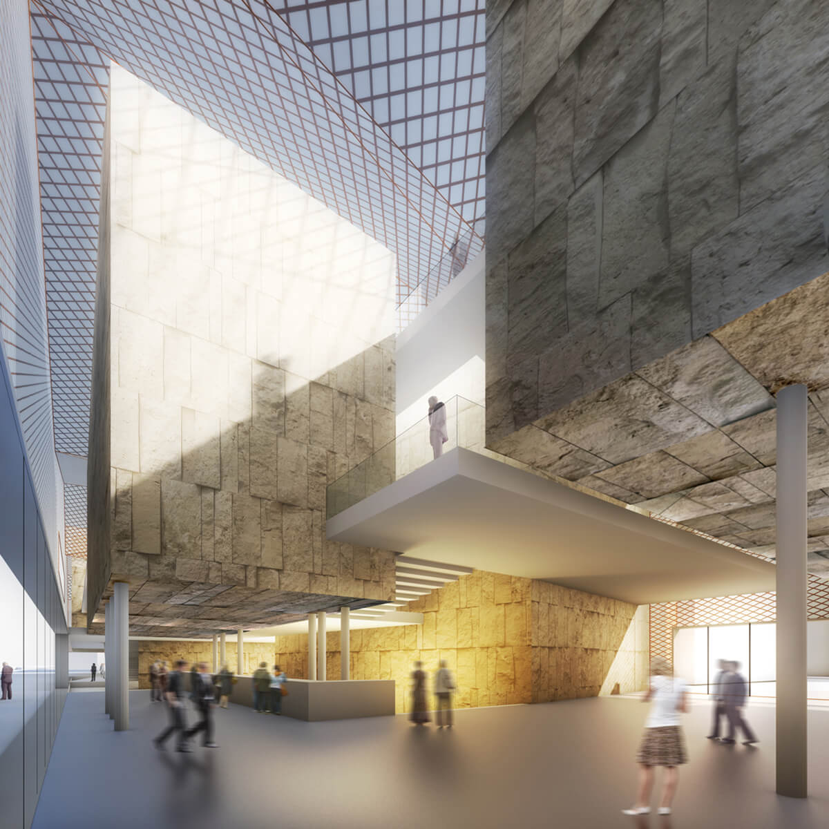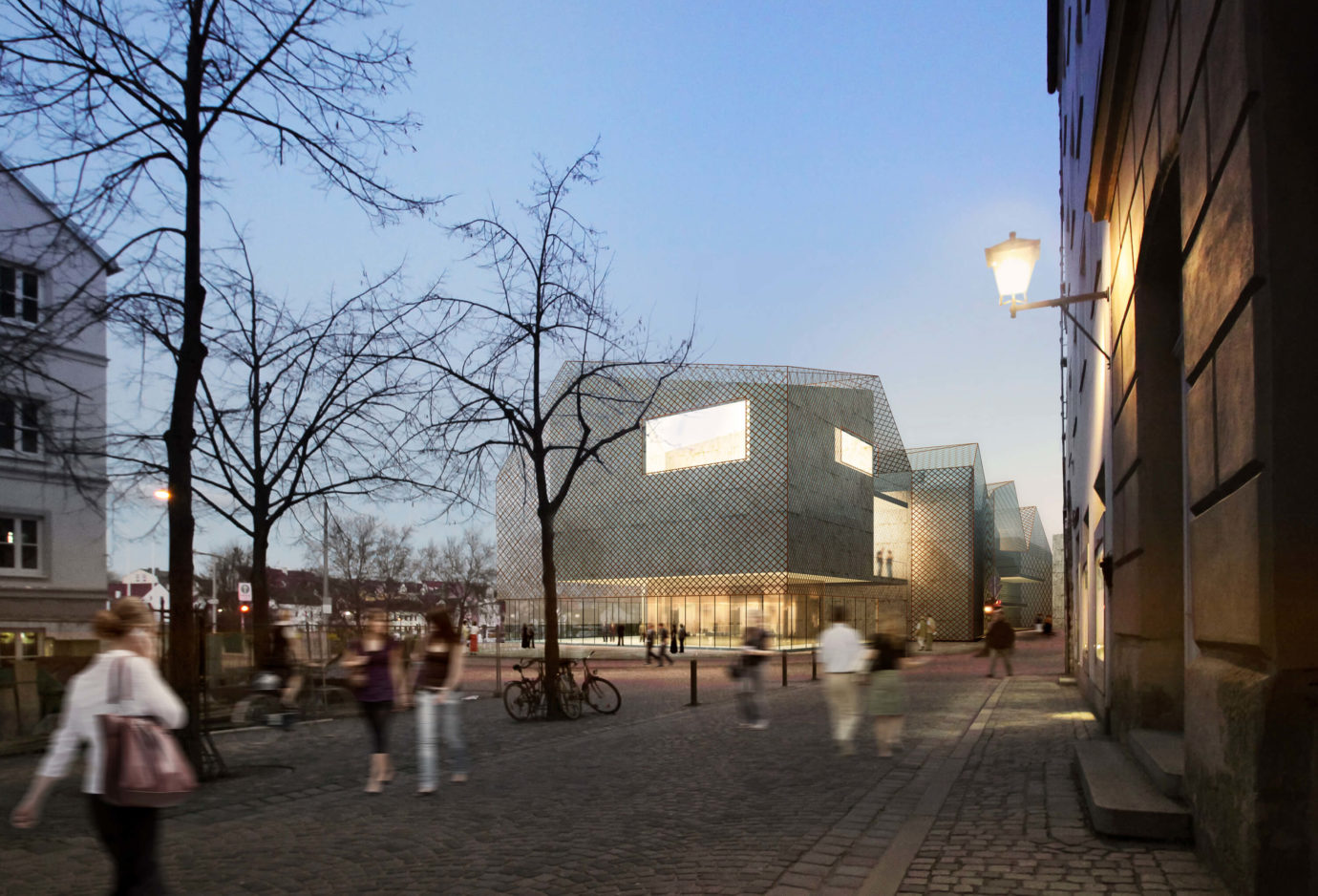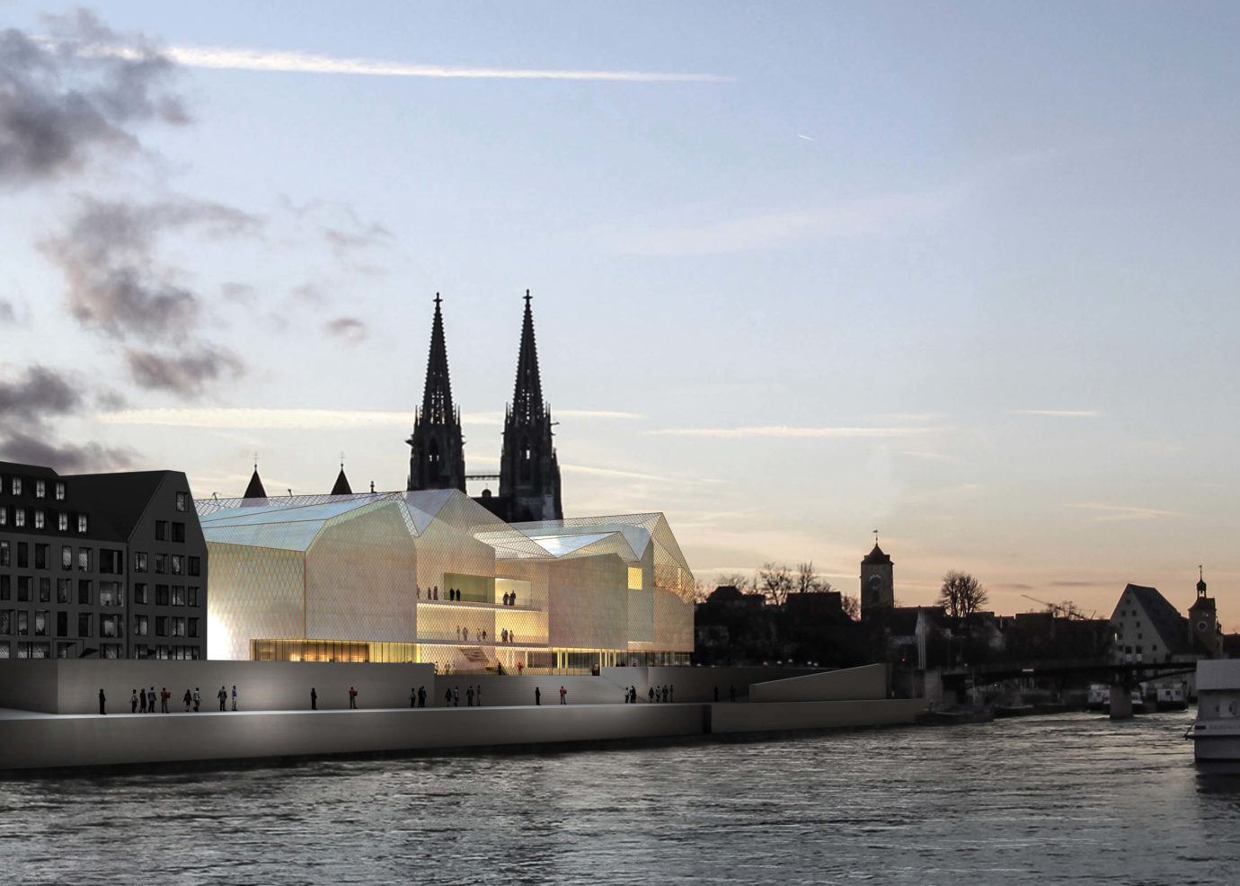 Entlang der Donau, im sensiblen Altstadtkontext präsentiert sich das Museum der Bayerischen Geschichte. Durch die präzise ausformulierte Dachlandschaft fügt es sich nahtlos in das Stadtbild ein und setzt doch einen eigenständigen, städtebaulichen Akzent mit hoher Attraktivität. Fünf Häuser, die durch eine perforierte Metallhaut, die sich wie ein Tuch über sie legt, miteinander verbunden sind, beinhalten die Dauer- und Sonderausstellungen. Sie lassen Raum zum Erkunden, Entdecken und Lernen. Gassen, Stege und Wege umspielen die Häuser/ Kubaturen und schaffen spannende Schnittstellen und Freiflächen, die einen dörflich anmutenden Charakter entstehen lassen. Diese Zwischenzonen bieten Möglichkeiten zum Verweilen, zur Interaktion und Kommunikation und lassen bewusst gerichtete Ausblicke zur Donau und spannende Blickbezüge zur Altstadt entstehen. Die Fassade öffnet sich großzügig zur Donaupromenade und zum neu entstandenen südlichen Platz und nimmt die Besucher aus den unterschiedlichen Richtungen in einem lichtdurchfluteten Foyer in Empfang. Von hier begibt sich der Besucher auf einen klar gezeichneten Rundweg durch die Bayerische Geschichte.