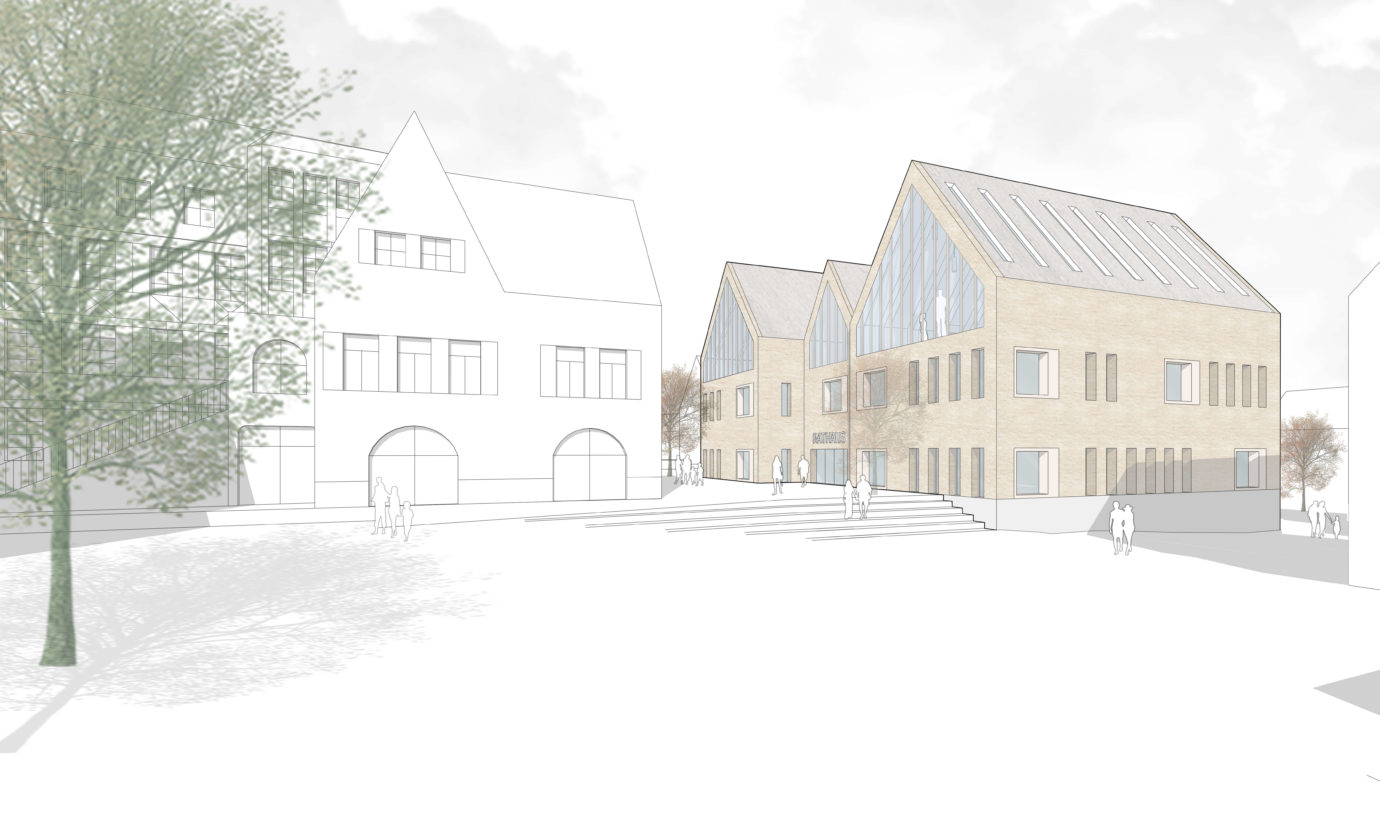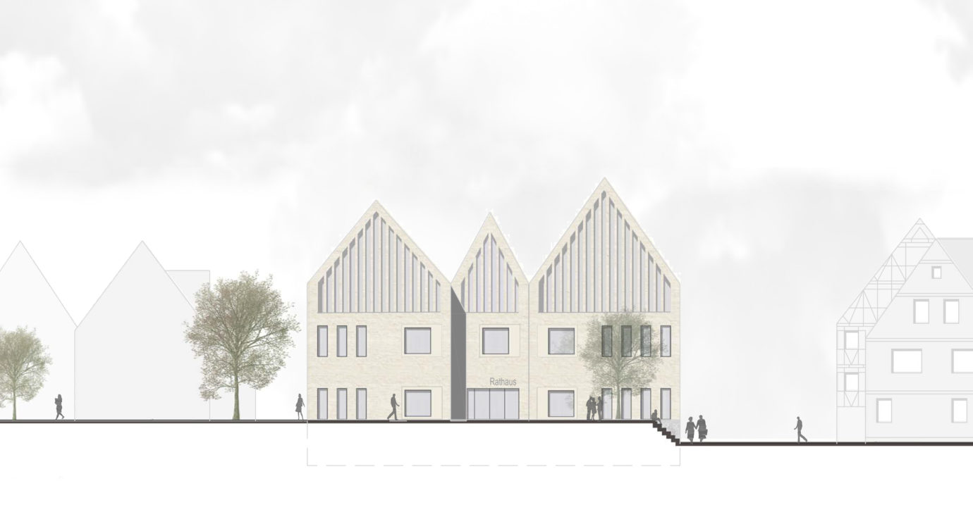 Das Umfeld des neuen Rathauses wird durch geprägt durch giebelständige Altbauten sowie durch die Nähe zum Marktplatz und zum Kirchumfeld. Der Entwurf sieht drei Baukörper mit drei Satteldächer in unterschiedlicher Ausprägung vor. Der Dreiklang spiegelt sowohl inhaltlich als auch formal durch Form und Fassadengestaltung die Bedeutung der öffentlichen Nutzung wider.