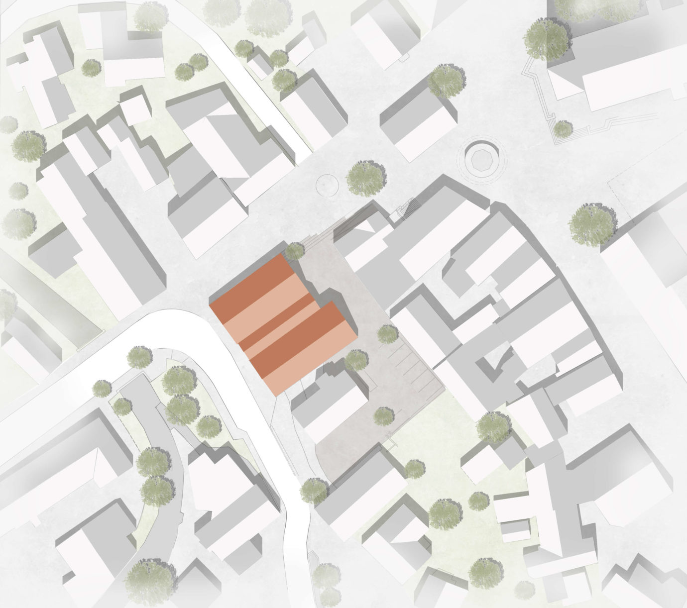 Durch die Differenzierung der Dächer wird die kleinteilige Struktur der Altstadt aufgenommen und neu interpretiert. Die Giebelseiten orientieren sich hin zum Marktplatz, zum historischen Rathaus und zur Kirche. Durch den Versatz eines Baukörpers Richtung Rathaus II entsteht ein kleiner Vorplatz der zugleich die Eingänge zum neuen Rathaus als auch zum zukünftigen Bürgerbüro darstellt. Im Dachgeschoss befinden sich prominent der große Gemeinderatssaal und angrenzende der Trausaal mit dem großzügigen Foyer mit Blick auf das historische Rathaus und die Martinskirche.